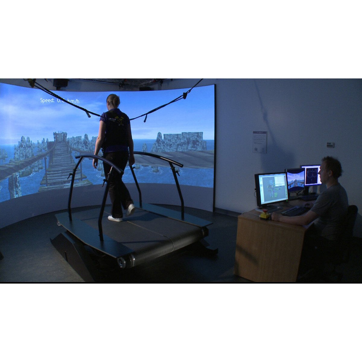 - Сенсорная беговая дорожка с двумя независимыми беговыми полотнами (для левой/правой ноги), режимами пертурбации (наклон, толчок, раскачка) и адаптивного темпа