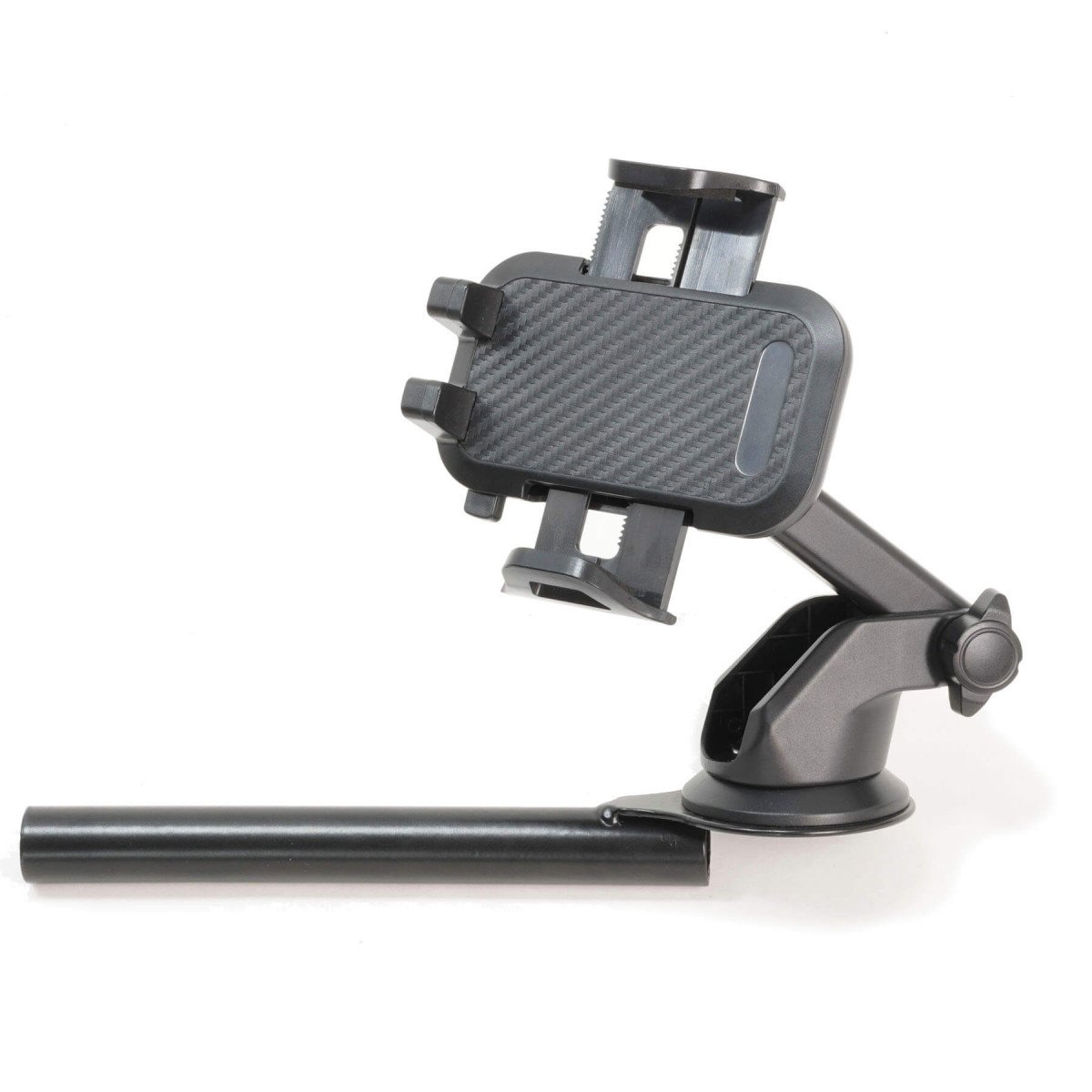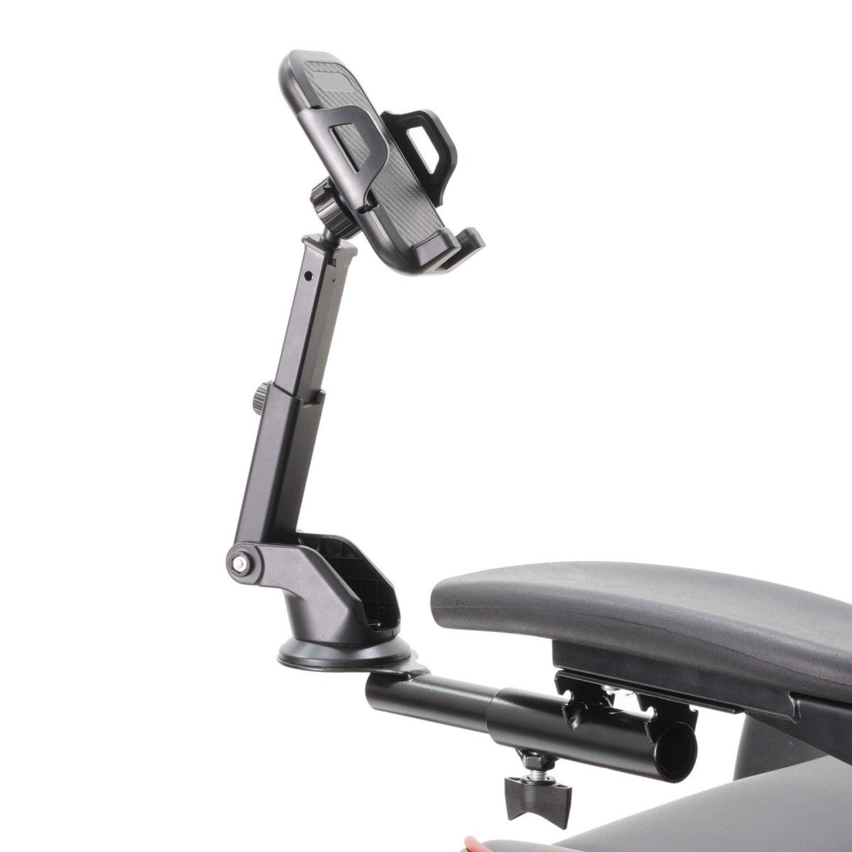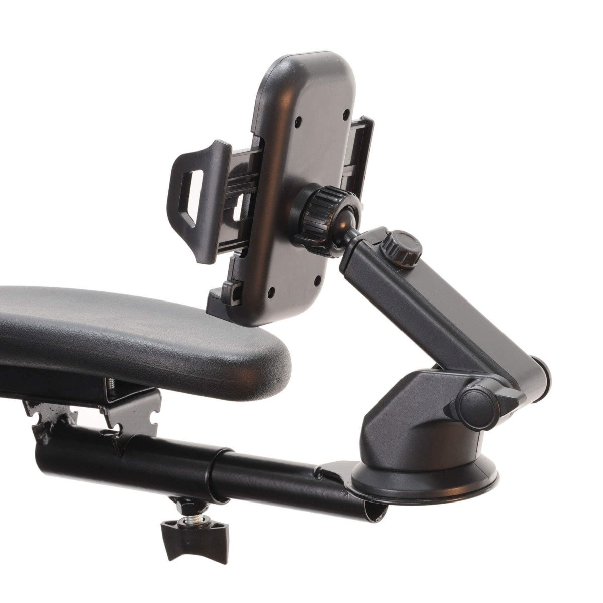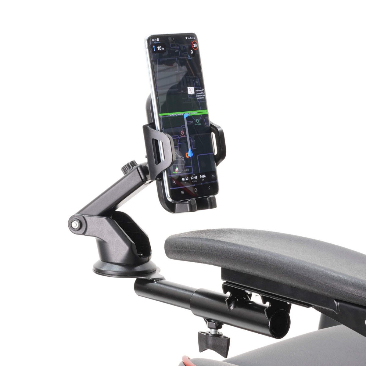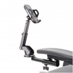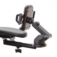 Пять регулировок (длина вылета от подлокотника, поворот, наклон, длина вылета крепления, шаровая регулировка держателя) позволяют настроить положение максимально гибко. Минимальная ширина телефона 55 мм, максимальная – 105 мм