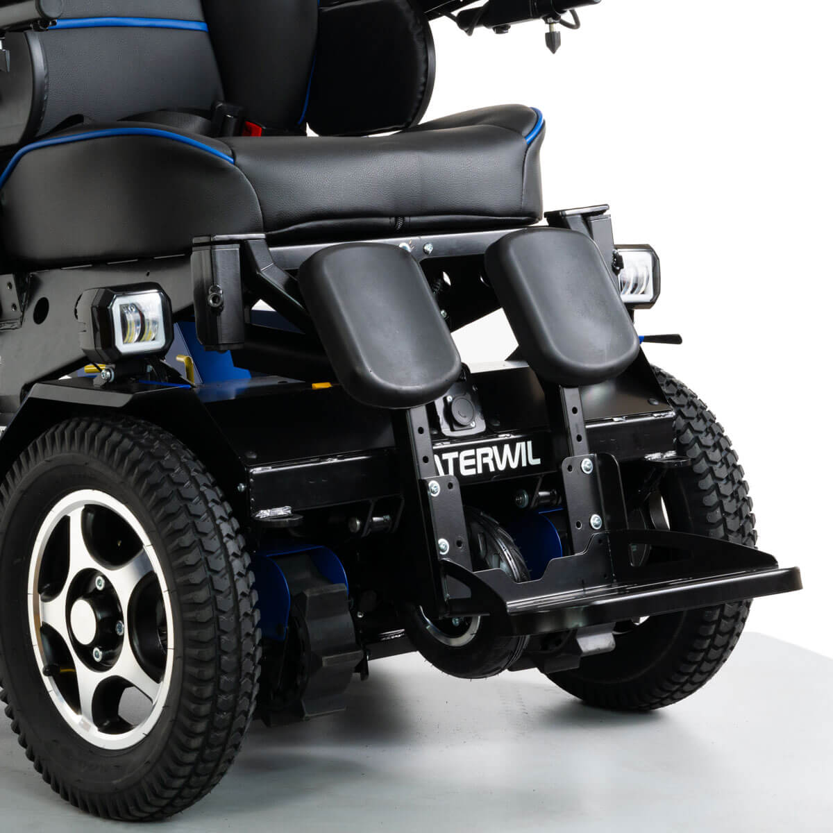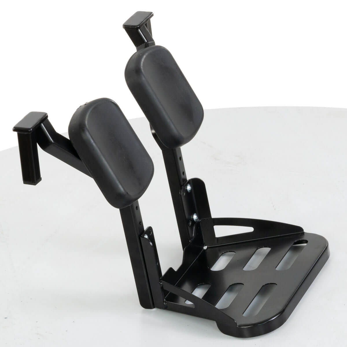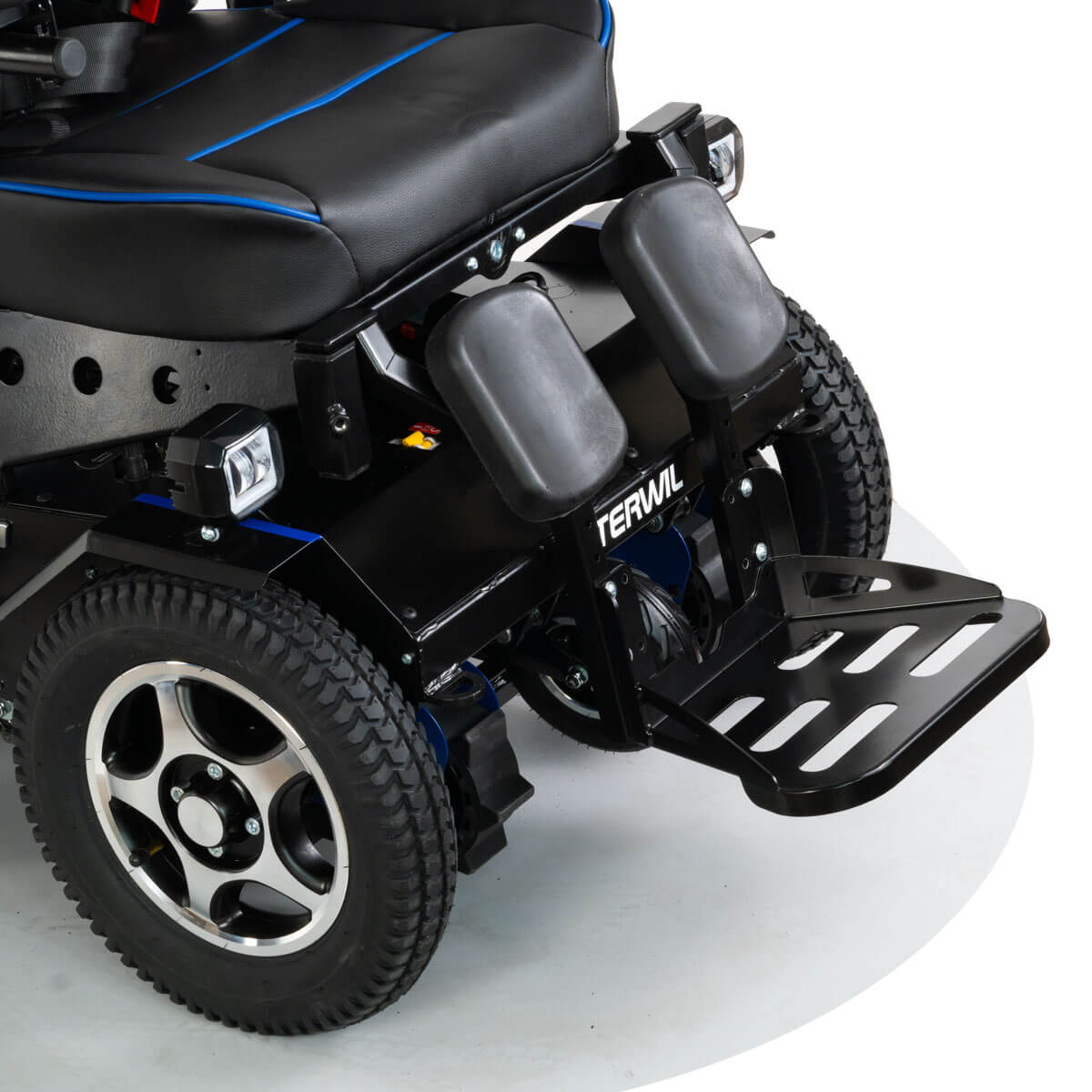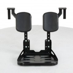 Слитная подножка значительно облегчает пересаживание к коляску, так как не имеет боковых элементов и шарниров. Также слитная конструкция исключает западание ноги между опорами. Подножка является фиксированной и не регулируется по углу наклона. Опора ног имеет места крепления ремня для фиксации ступней от выпадания.