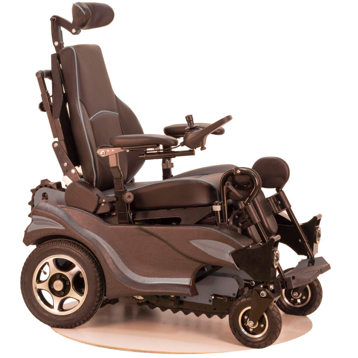 GTS5 оснащена электромагнитными тормозами, которые полностью блокируют движение в случае отключения питания, обеспечивая максимальную безопасность. При необходимости коляску можно перевести в ручной режим — для этого предусмотрены специальные транспортировочные рукоятки.