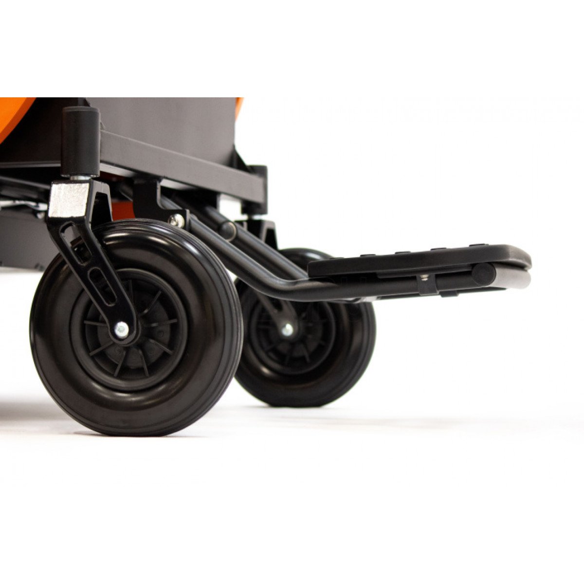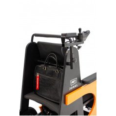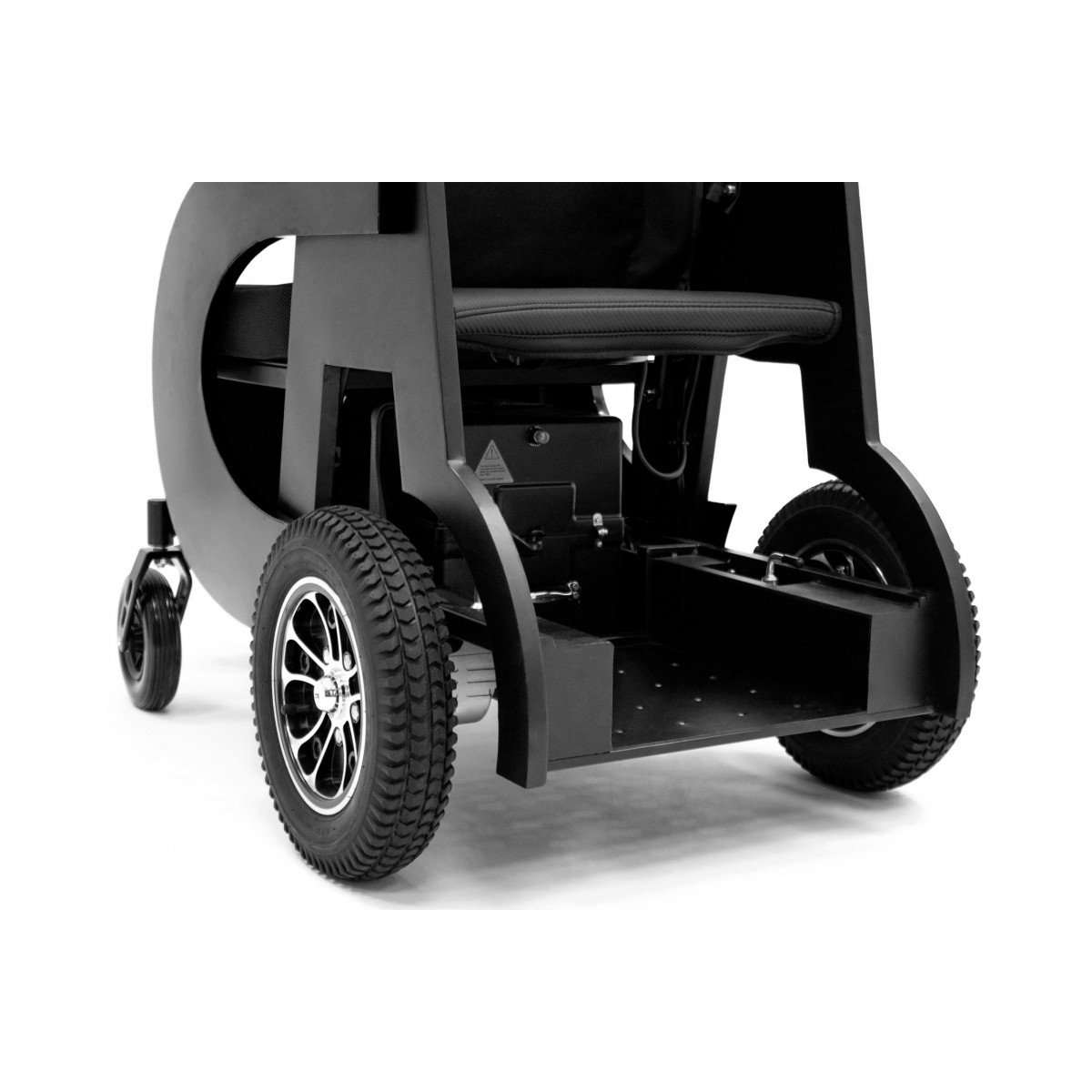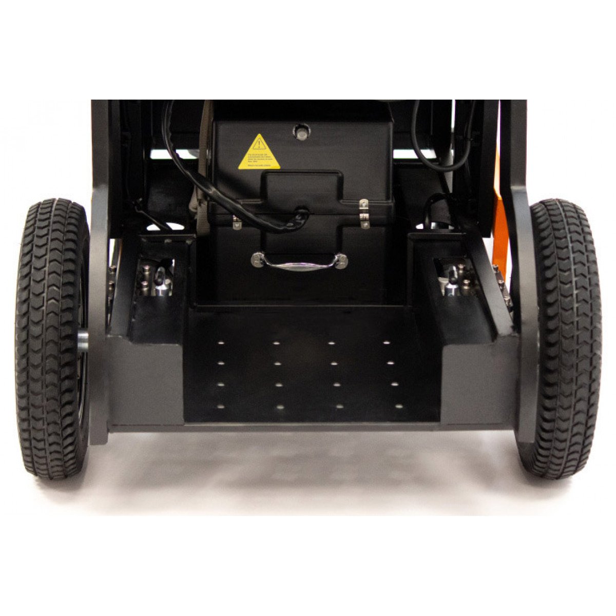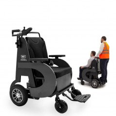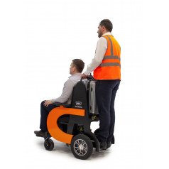Управление электрической коляской осуществляется сопровождающим, стоящим на специальной платформе позади коляски. Пульт управления (джойстик) удобно расположен на регулируемой по высоте опоре. Коляска оснащена ремнем безопасности для пассажира, а также полкой для перевозки ручной клади.