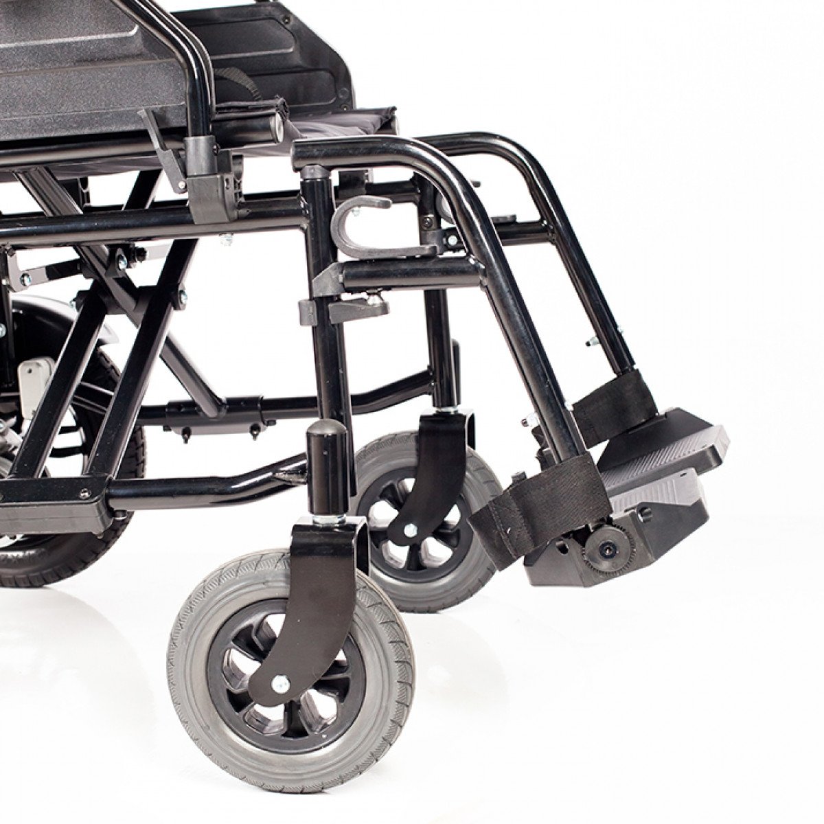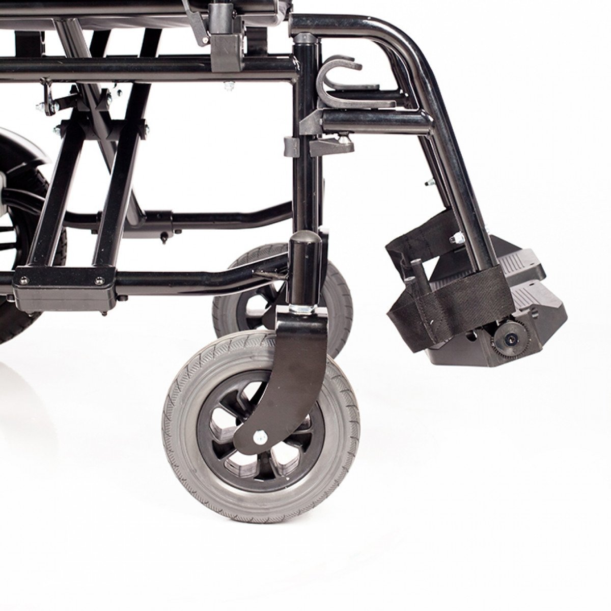 Коляска проста в использовании: пульт управления можно установить с удобной стороны и настроить по вылету, а при отключении электропривода модель легко переводится в режим сопровождения. Подлокотники и подножки — съёмно-откидные, что упрощает пересаживание и настройку под пользователя. Спинка складная, а сиденье выполнено из прочного материала, который не растягивается и легко очищается.