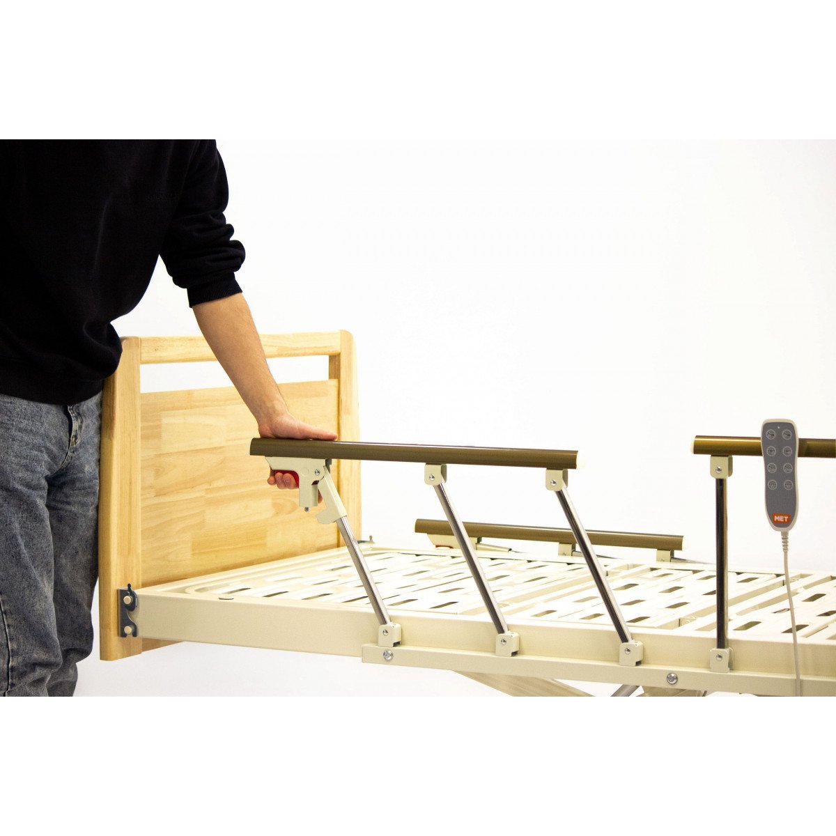 Кровать оснащена электрическими регулировками спины и ног, что помогает подобрать удобное положение, в том числе положение Фаулера — полусидя или полулёжа. Такое расположение тела улучшает дыхание, снижает нагрузку на позвоночник, облегчает общение и уход. Съёмные изголовье и изножье, а также складывающиеся боковые ограждения обеспечивают безопасность и удобство при ежедневном использовании.