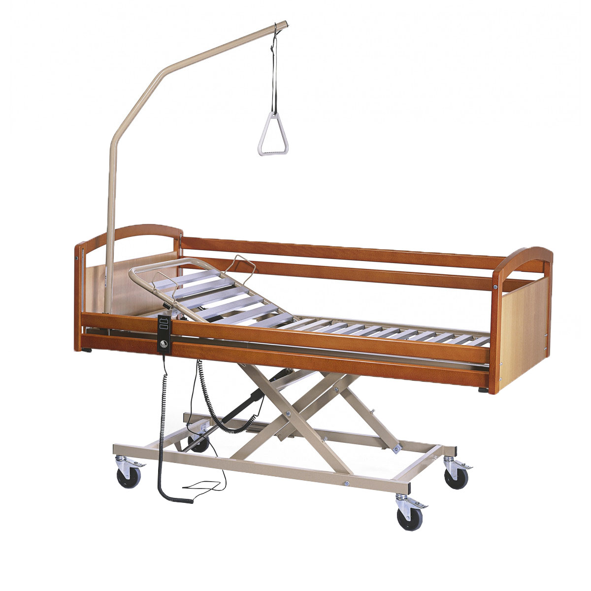 Высота спинной части и положение таза настраиваются с помощью пульта. Кровать установлена на колёса с индивидуальными тормозами. Металлические элементы покрыты порошковой краской, изголовье и изножье выполнены из дерева.