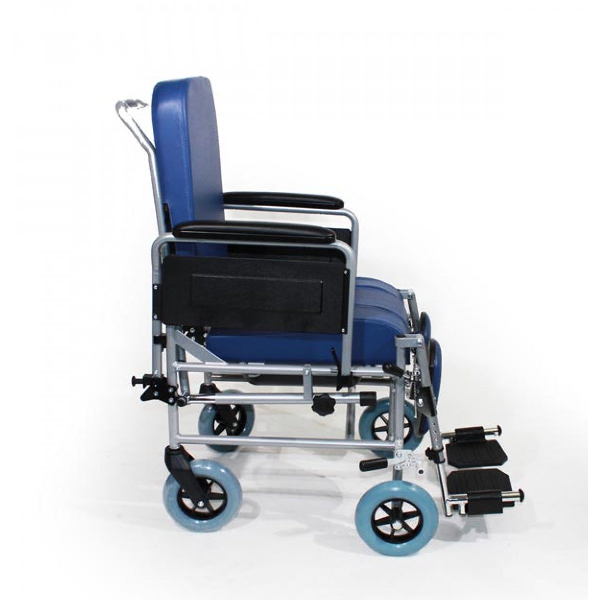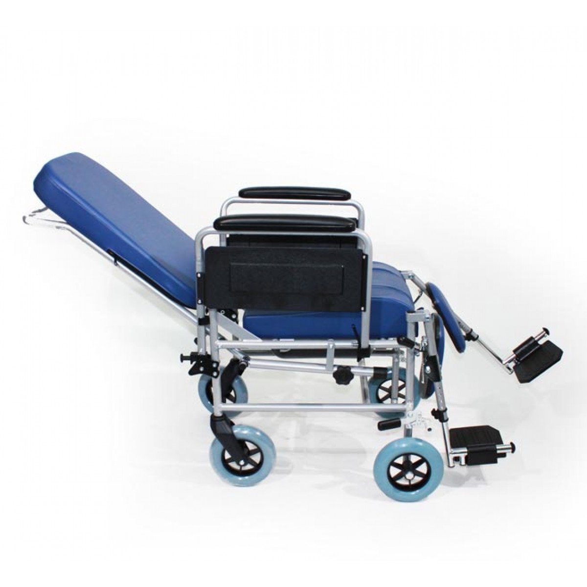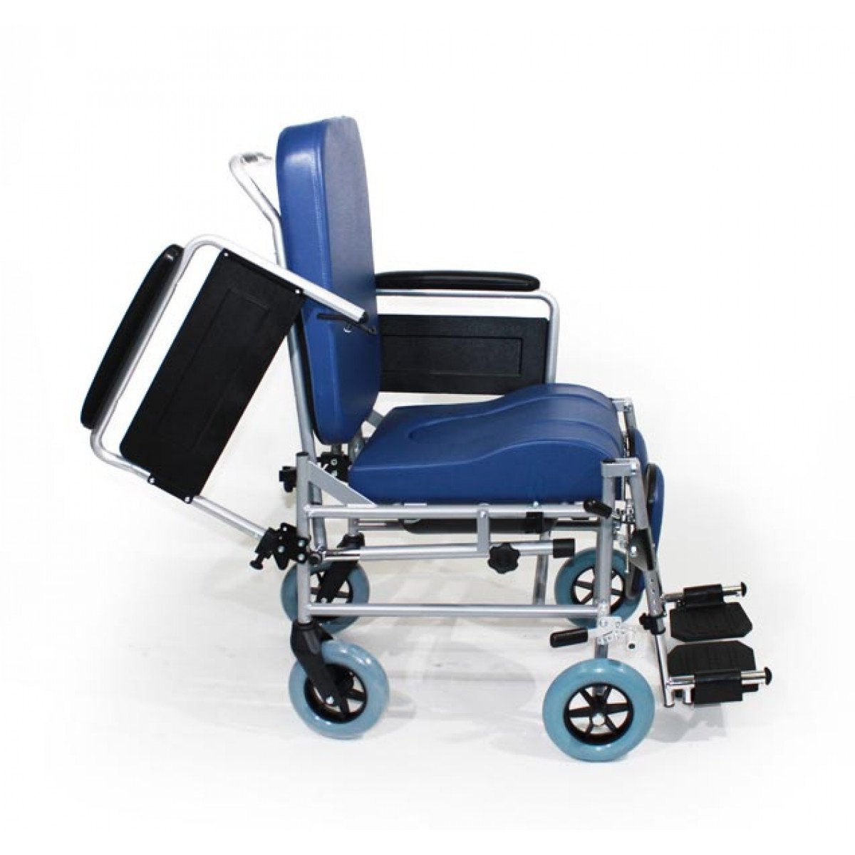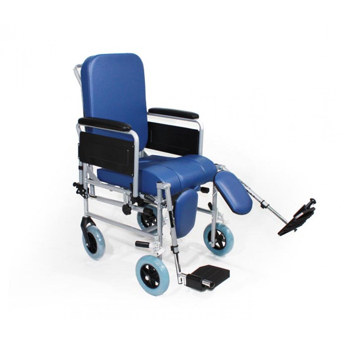 Конструкция включает анатомическое сиденье с возможностью откидывания спинки до 45° для комфортного размещения. Удлинённые подлокотники и регулируемые по углу наклона подножки с упорами для голеней повышают удобство посадки и поддержки. Под сидением расположен съёмный санитарный контейнер из ударопрочного пластика, который легко устанавливается, снимается и поддаётся дезинфекции.