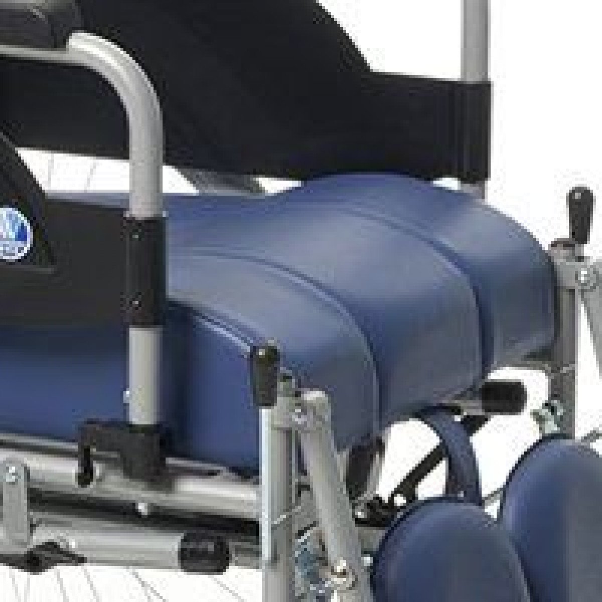 Конструкция включает анатомическое сиденье со спинкой, регулируемой по углу наклона до 45°, съёмные удлинённые подлокотники и ортопедические подножки с упорами под голени, которые можно настраивать по высоте и углу. Под сиденьем установлен съёмный пластиковый контейнер, легко очищаемый и пригодный для дезинфекции.