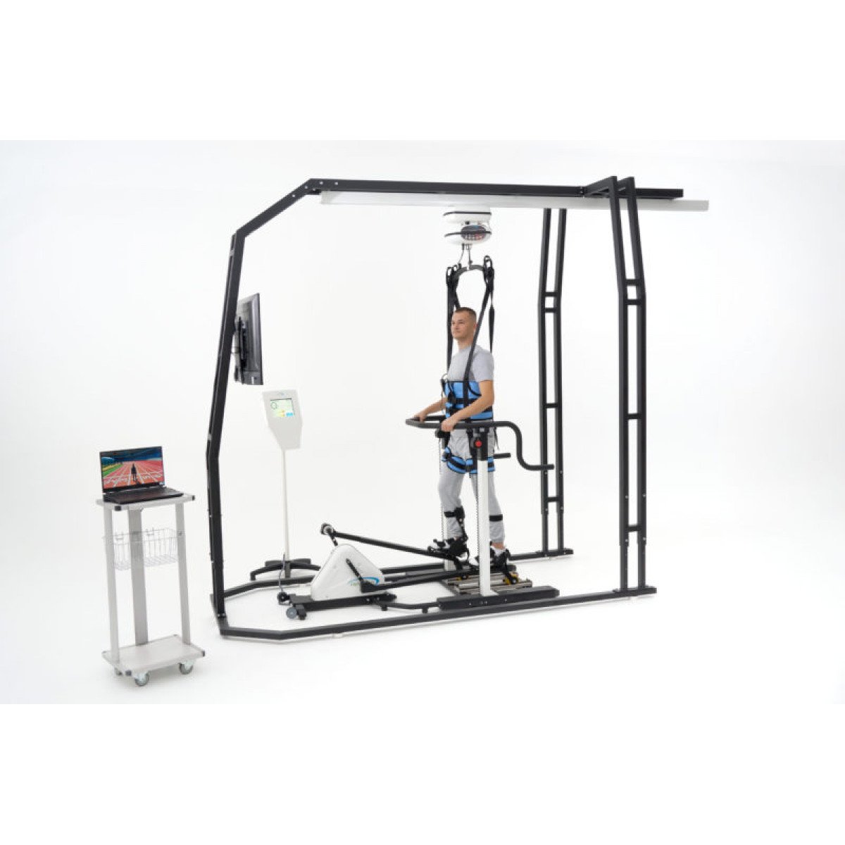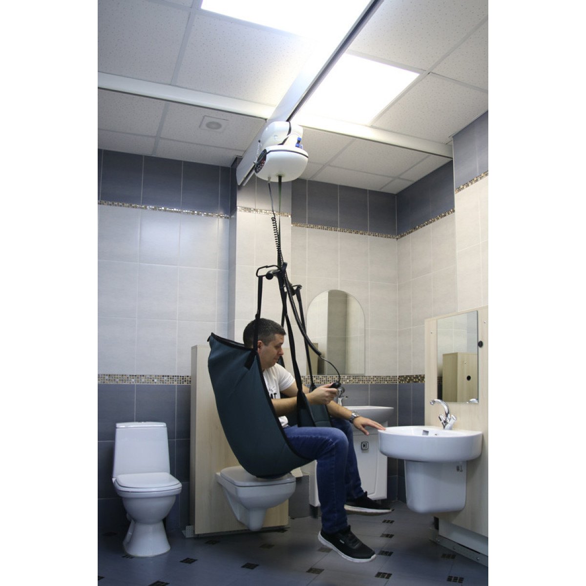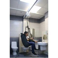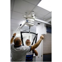 Рельсы могут устанавливаться на потолке или стенах и охватывать любое пространство — от отдельной зоны до всего помещения. В зависимости от конфигурации система работает как прямой монорельс, позволяющий перемещать пациента между двумя точками, либо как траверсная система — когда подвижная перекладина двигается по рельсам и позволяет свободно перемещаться по всей комнате. Управление подъёмом и перемещением остаётся простым и безопасным: это может делать и персонал, и сам пользователь, если это позволяет его состояние.