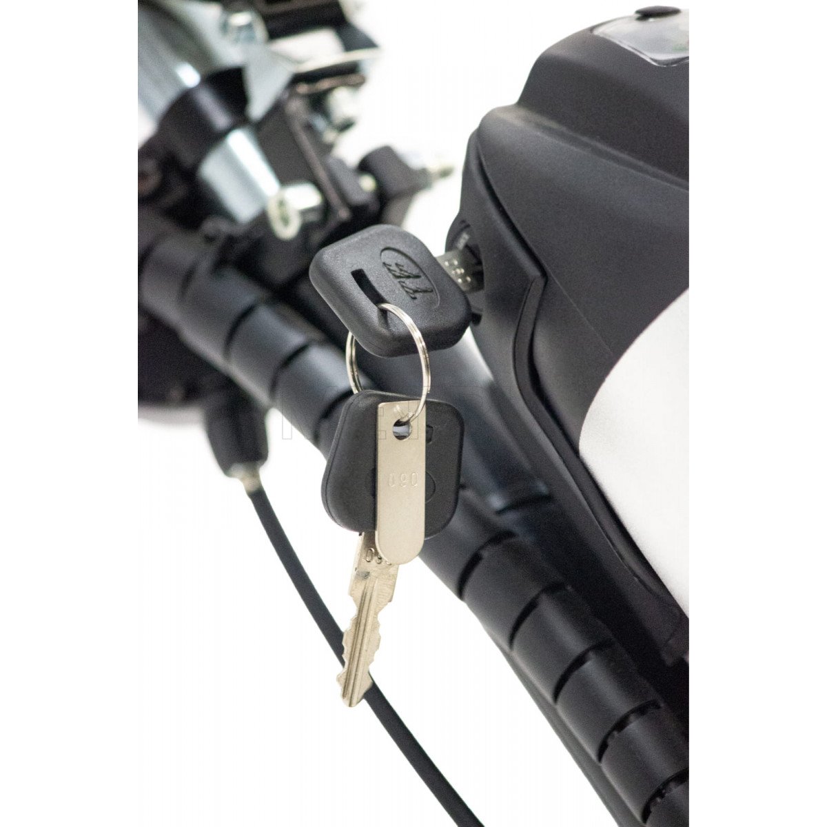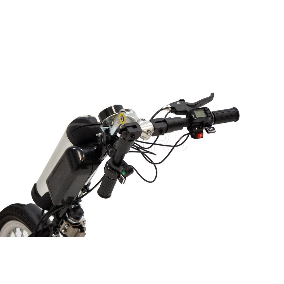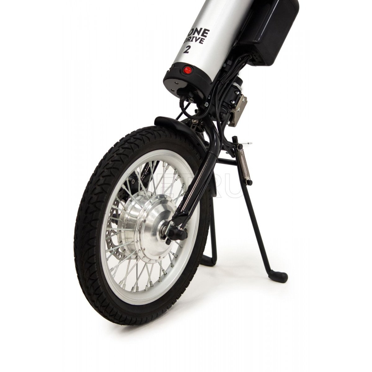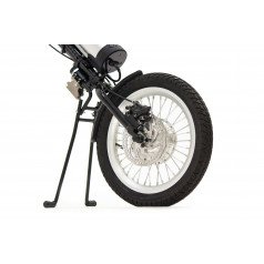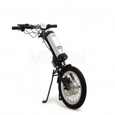 Электропривод включает в себя моторколесо с пневматической шиной, механический дисковый тормоз и систему крепления, которая удобно фиксирует его к подножкам вашей коляски и рулю, выполненному в мотоциклетном стиле. Для безопасных поездок в темное время суток предусмотрено мощное диодное освещение.