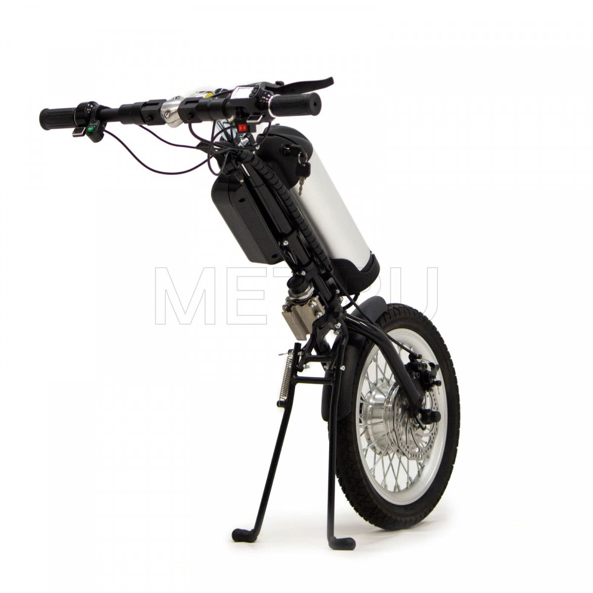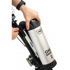 Электроприставка для инвалидной коляски Met OneDrive 2 (Мет ВанДрайв 2) преобразит вашу механическую коляску в электрический трицикл, позволяя вам наслаждаться быстрыми и длительными поездками. Эта приставка оснащена большим мото-колесом диаметром 40 сантиметров, которое установлено в амортизационную вилку с эластомерными пружинами. Эта система требует минимального технического обслуживания, что делает её удобной в использовании.