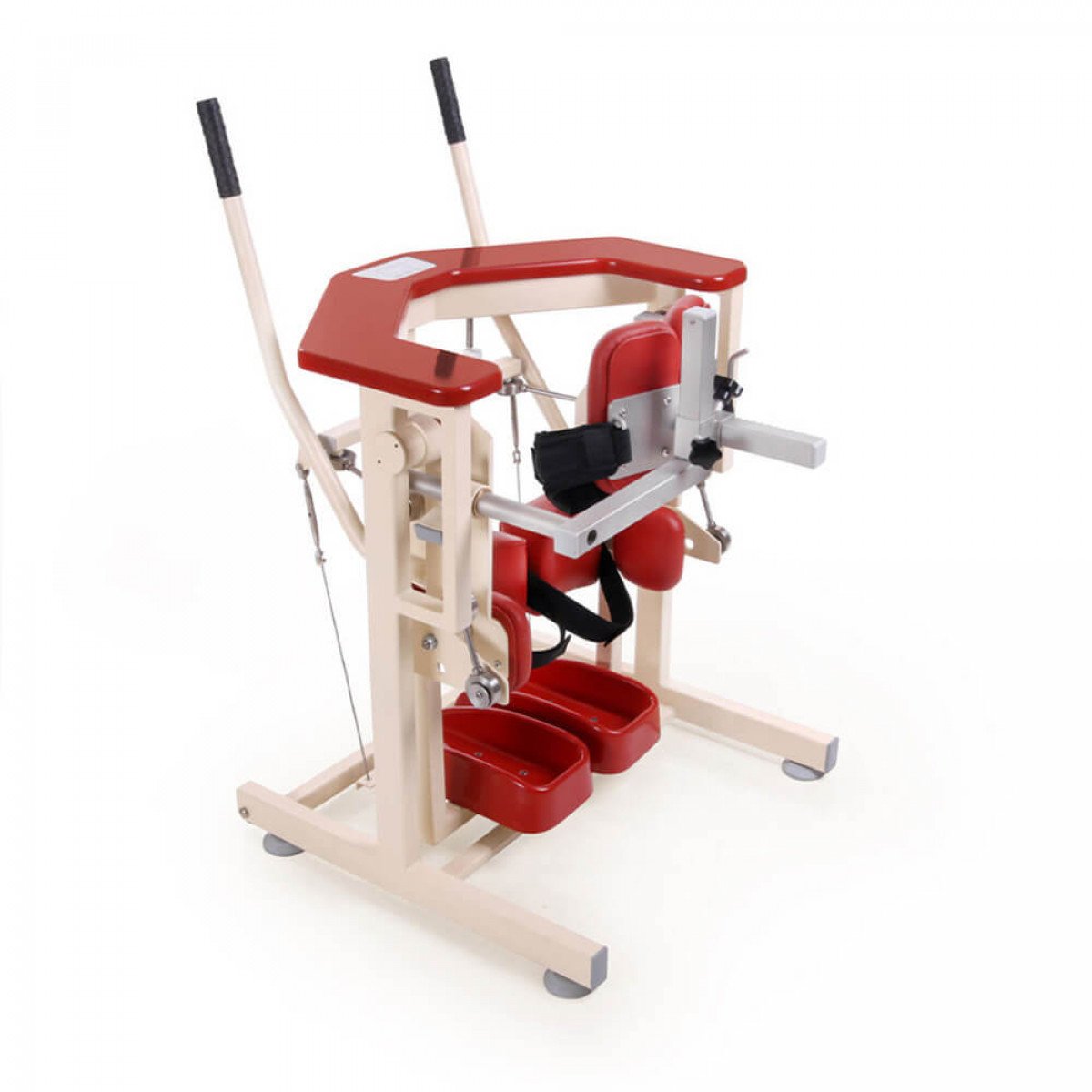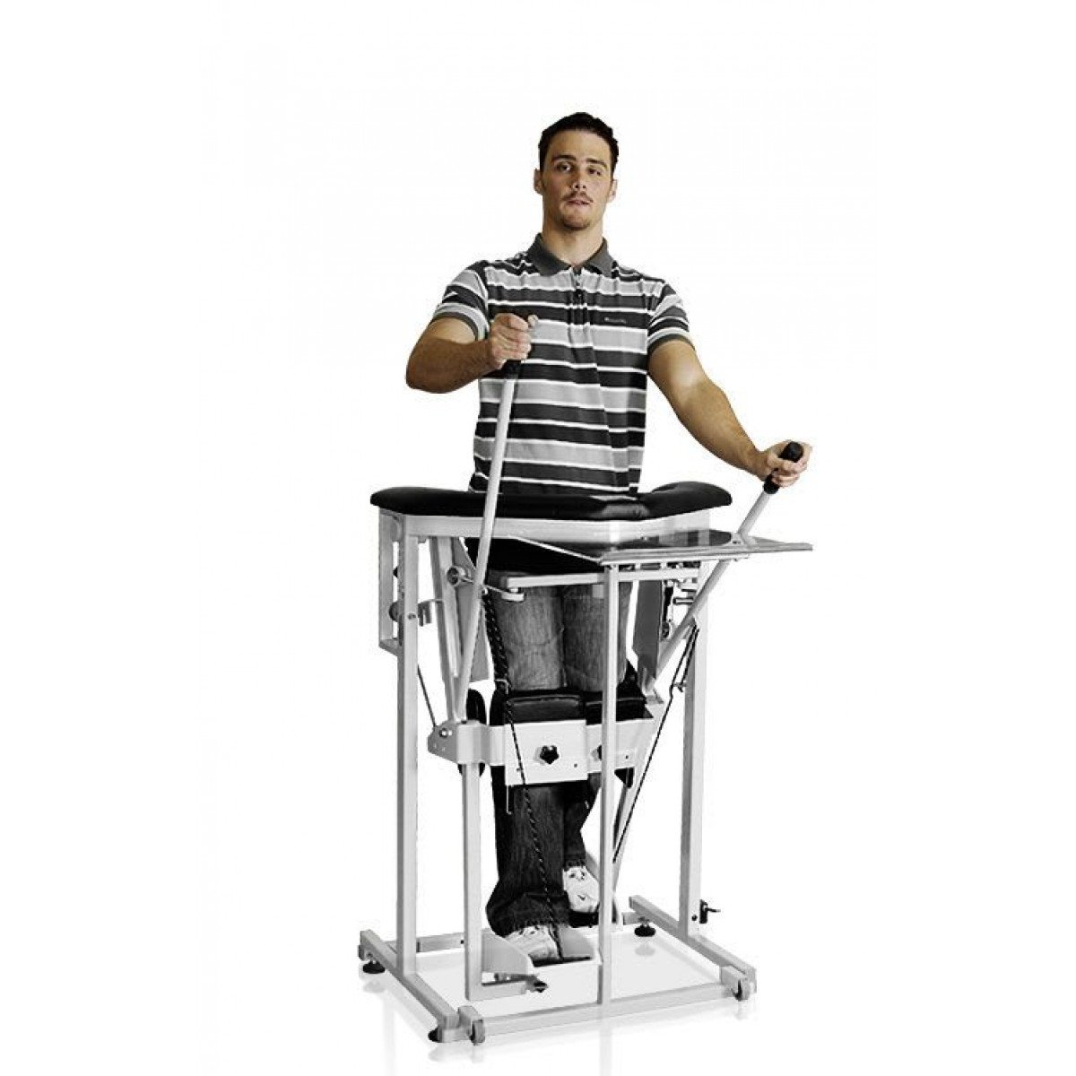 Meden-Inmed Pio подходит для реабилитационных центров, физкультурно-оздоровительных комплексов и домашнего использования. Система стабилизации надёжно поддерживает туловище, а регулируемые грудная и поясничная опоры позволяют как удобно вертикализировать пользователя, так и мягко подключать движения таза для формирования более естественного стереотипа ходьбы. При необходимости занятия возможны с помощью инструктора или дополнительной поддержки.