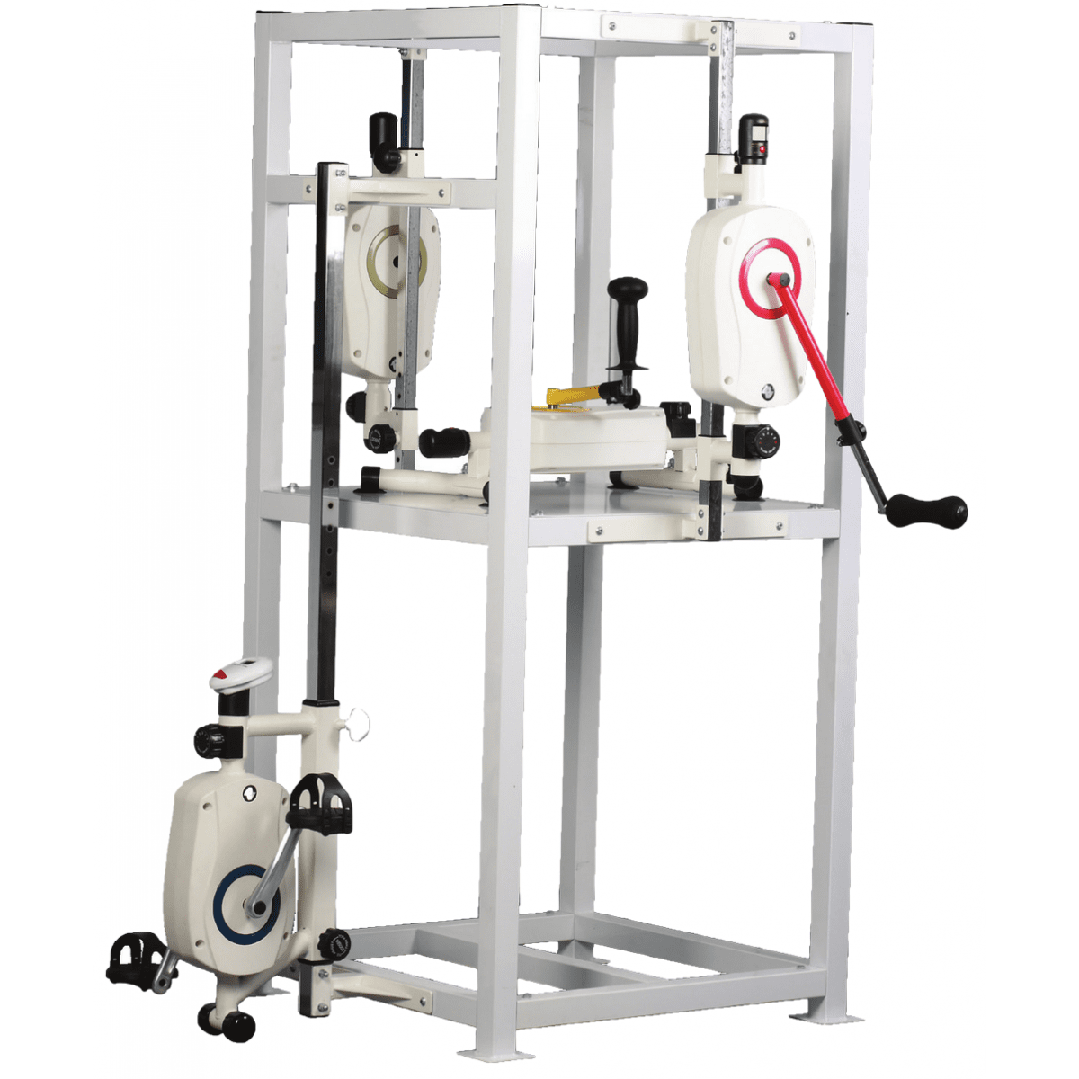 Стойка для тренажёров активной реабилитации Alexandave RK-WL-100 (Александэйв РК-ВЛ-100) предназначена для компактного размещения тренажёров, используемых для реабилитации верхних и нижних конечностей. Эта стойка позволяет организовать пространство без необходимости крепления оборудования к стенам, что делает её удобной для различных медицинских учреждений.