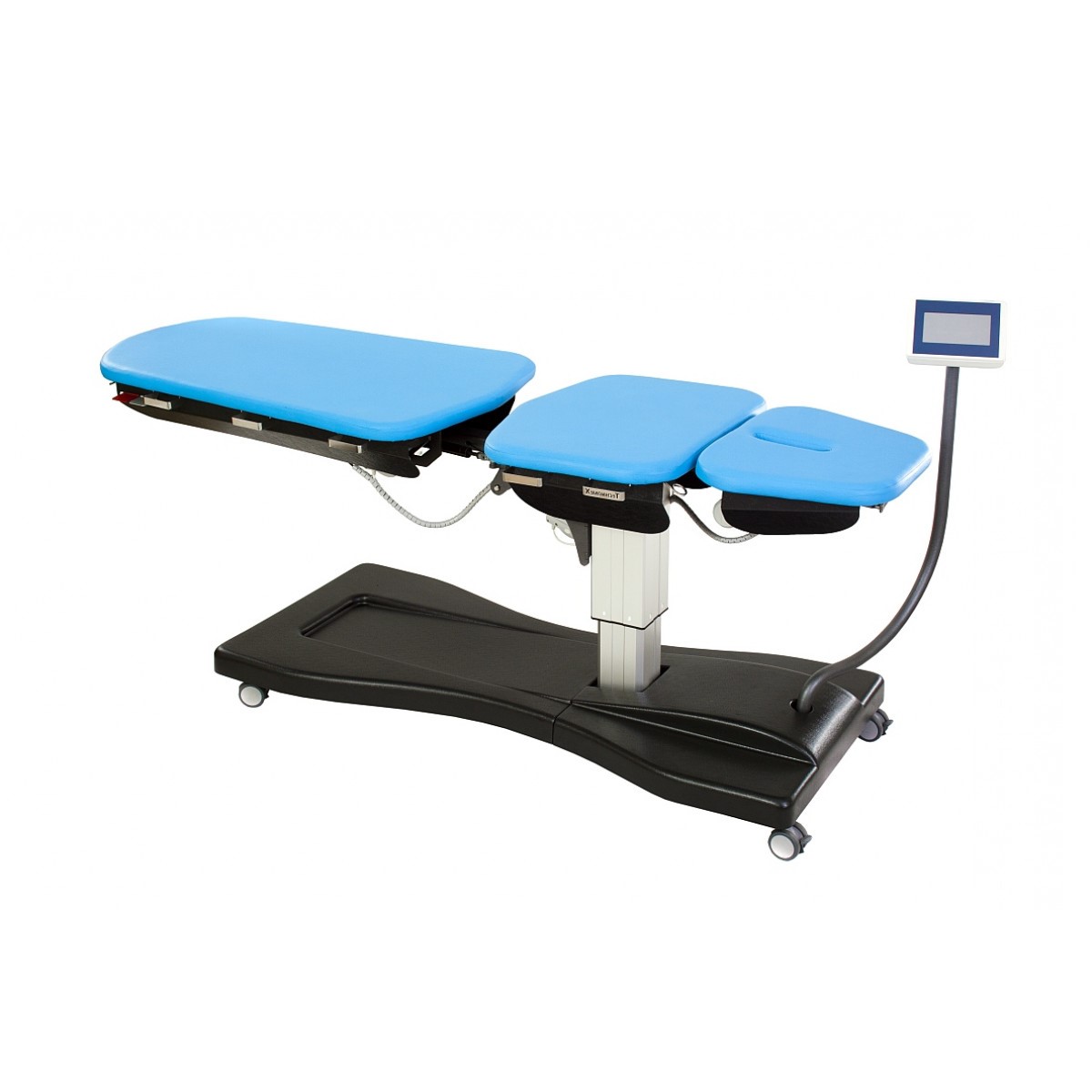 Головная и ножная секции стола оснащены газовыми пружинами, которые обеспечивают плавную регулировку наклона в положительном и отрицательном направлениях. Ножная секция дополнительно регулируется по вращению и отклонению относительно оси стола, что позволяет максимально адаптировать положение для комфорта пользователя. Управление всеми функциями выполняется через удобную сенсорную панель.