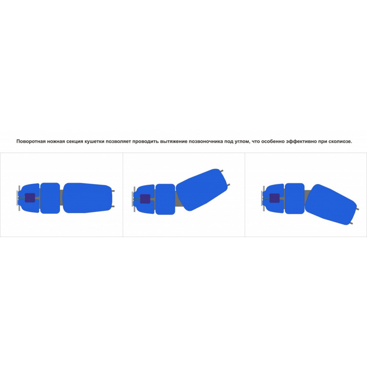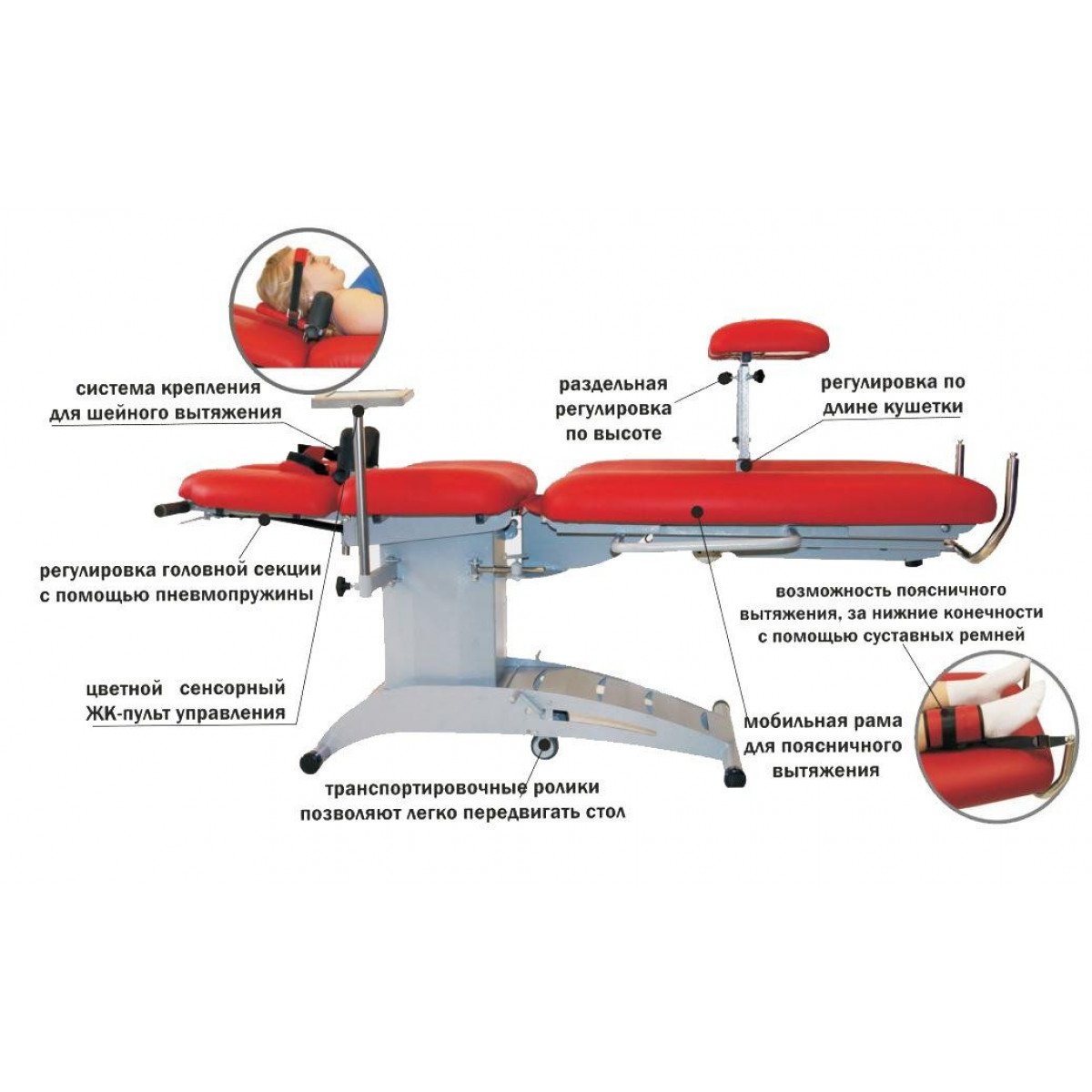 Он оснащён дисплеем для отображения силы вытяжения в реальном времени и таймером для настройки времени процедуры. Кушетка тренажёра имеет подвижную секцию, которая предотвращает трение при вытяжении, а в статическом положении может использоваться как массажный стол.